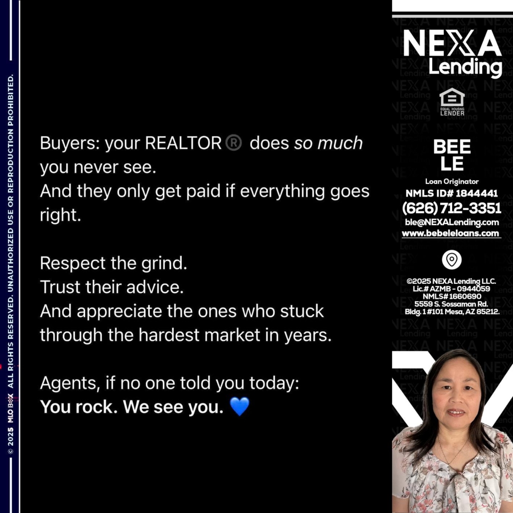 Hi, my name is Bebe Le- Serving California. I’m a Loan Officer with NEXA Mortgage LLC., offering personalized mortgage solutions, fast customized quotes, great rates and service with integrity.