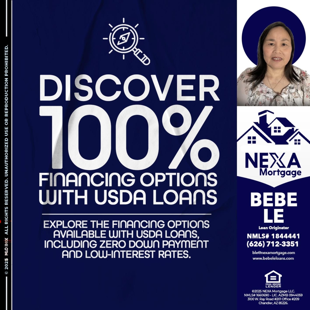 Hi, my name is Bebe Le- Serving California. I’m a Loan Officer with NEXA Mortgage LLC., offering personalized mortgage solutions, fast customized quotes, great rates and service with integrity.