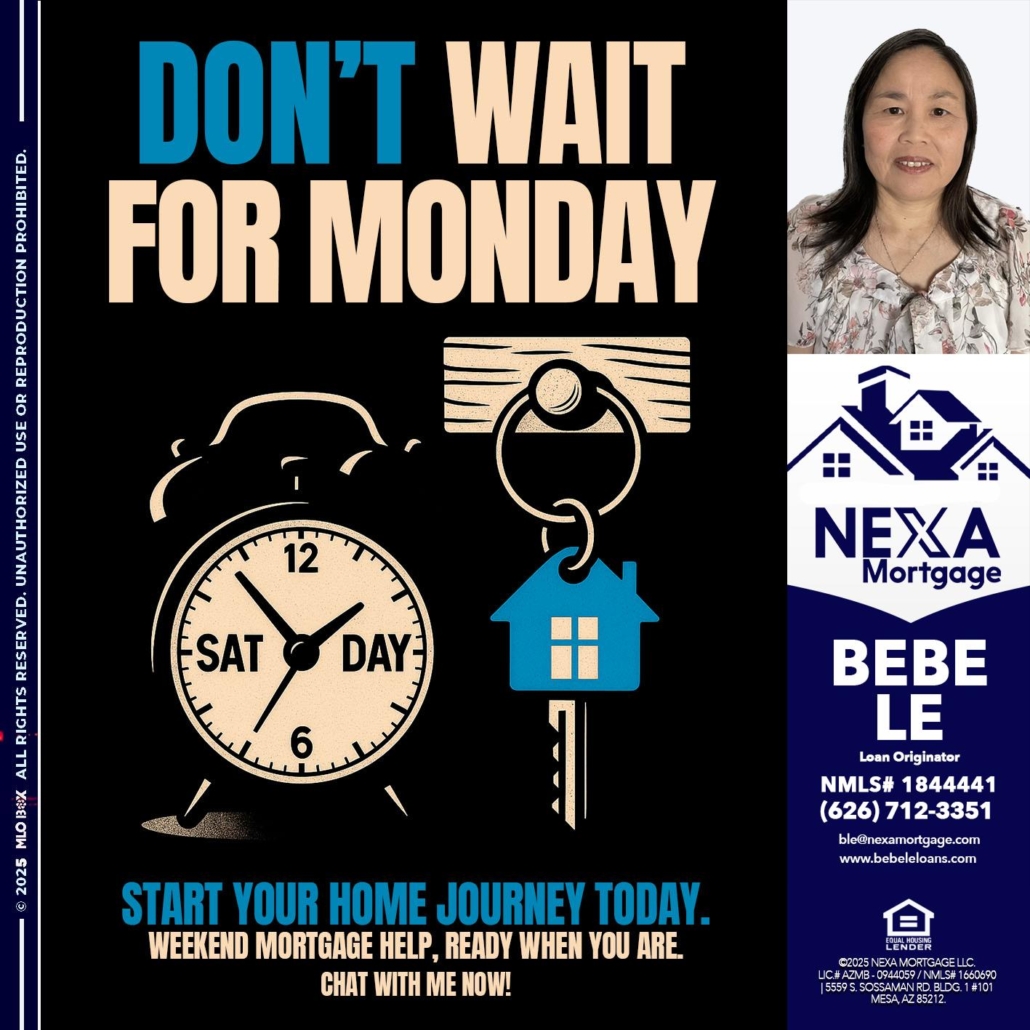 Hi, my name is Bebe Le- Serving California. I’m a Loan Officer with NEXA Mortgage LLC., offering personalized mortgage solutions, fast customized quotes, great rates and service with integrity.