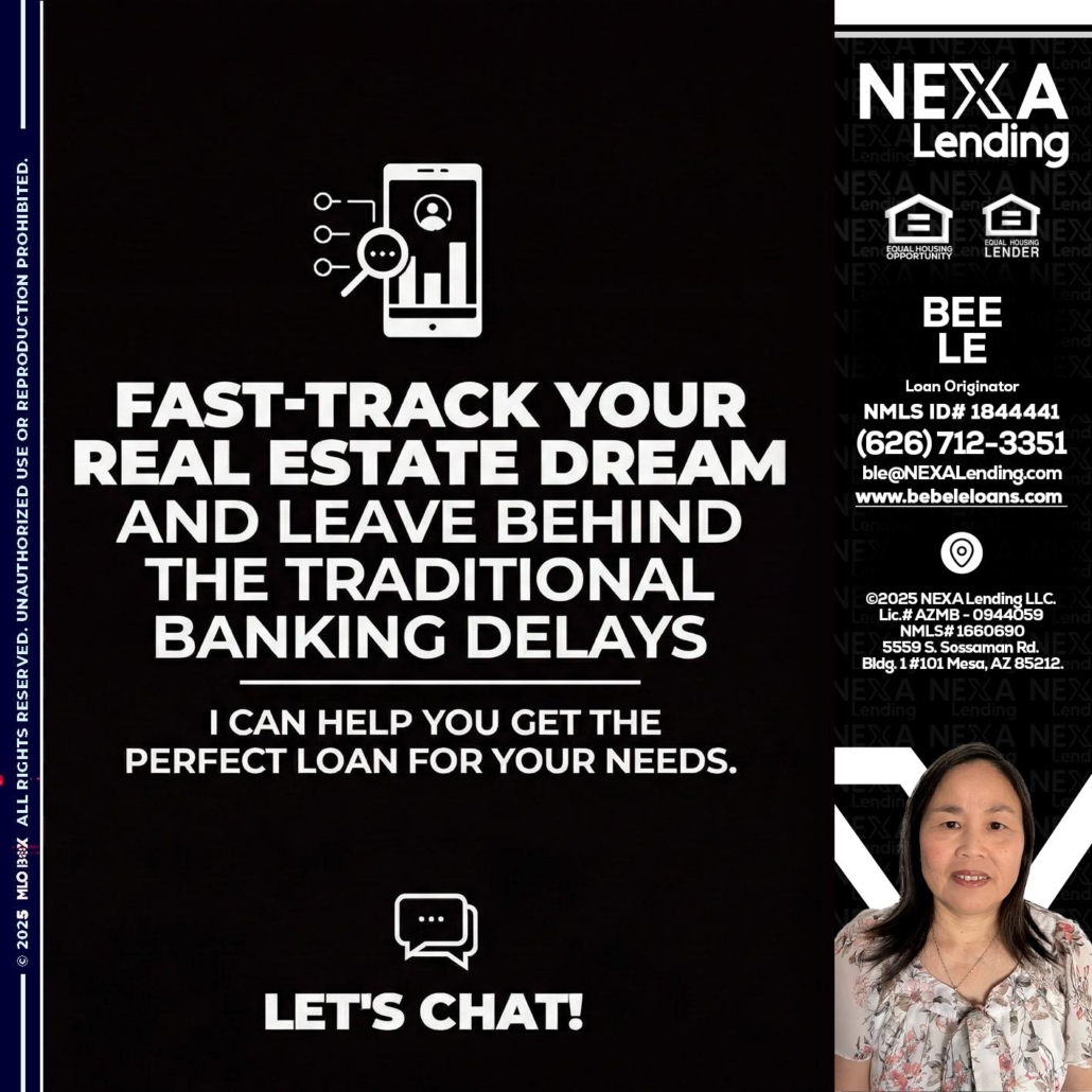 Hi, my name is Bebe Le- Serving California. I’m a Loan Officer with NEXA Lending LLC., offering personalized mortgage solutions, fast customized quotes, great rates and service with integrity.