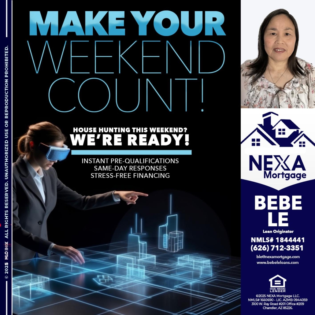 Hi, my name is Bebe Le- Serving California. I’m a Loan Officer with NEXA Mortgage LLC., offering personalized mortgage solutions, fast customized quotes, great rates and service with integrity.