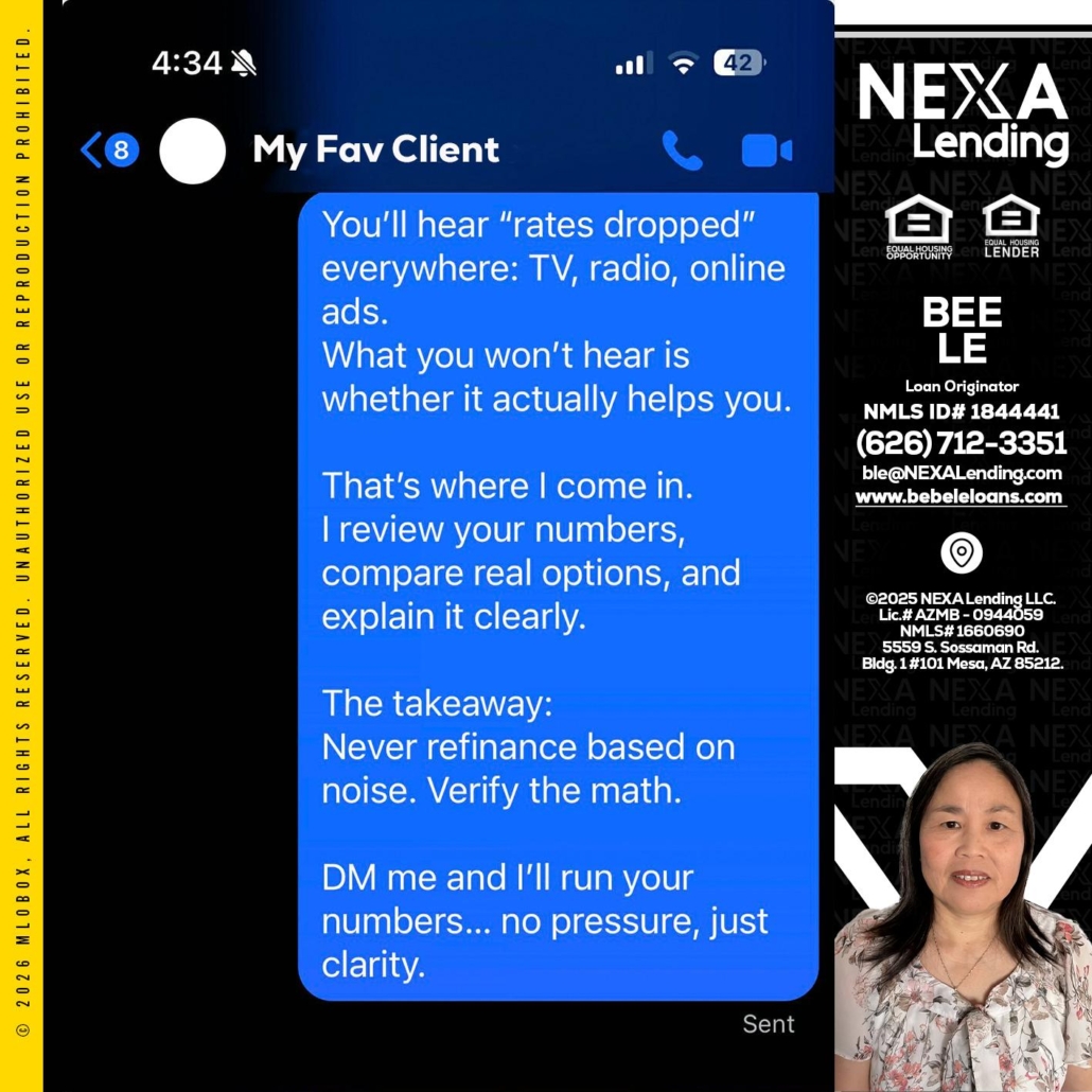 Hi, my name is Bebe Le- Serving California. I’m a Loan Officer with NEXA Lending LLC., offering personalized mortgage solutions, fast customized quotes, great rates and service with integrity.