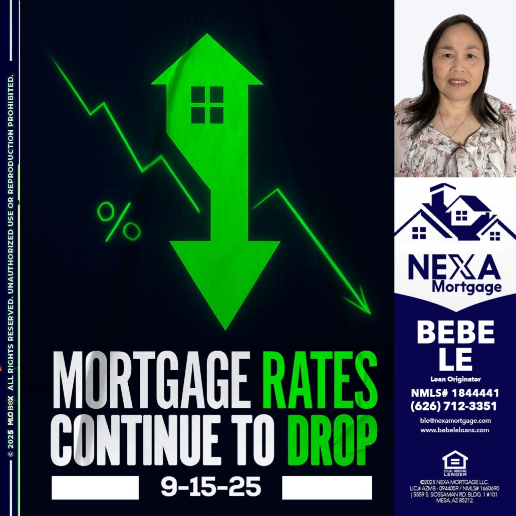 RATES DROP - Bebe Le- Serving California -Loan OriginatorHi, my name is Bebe Le- Serving California. I’m a Loan Officer with NEXA Mortgage LLC., offering personalized mortgage solutions, fast customized quotes, great rates and service with integrity.