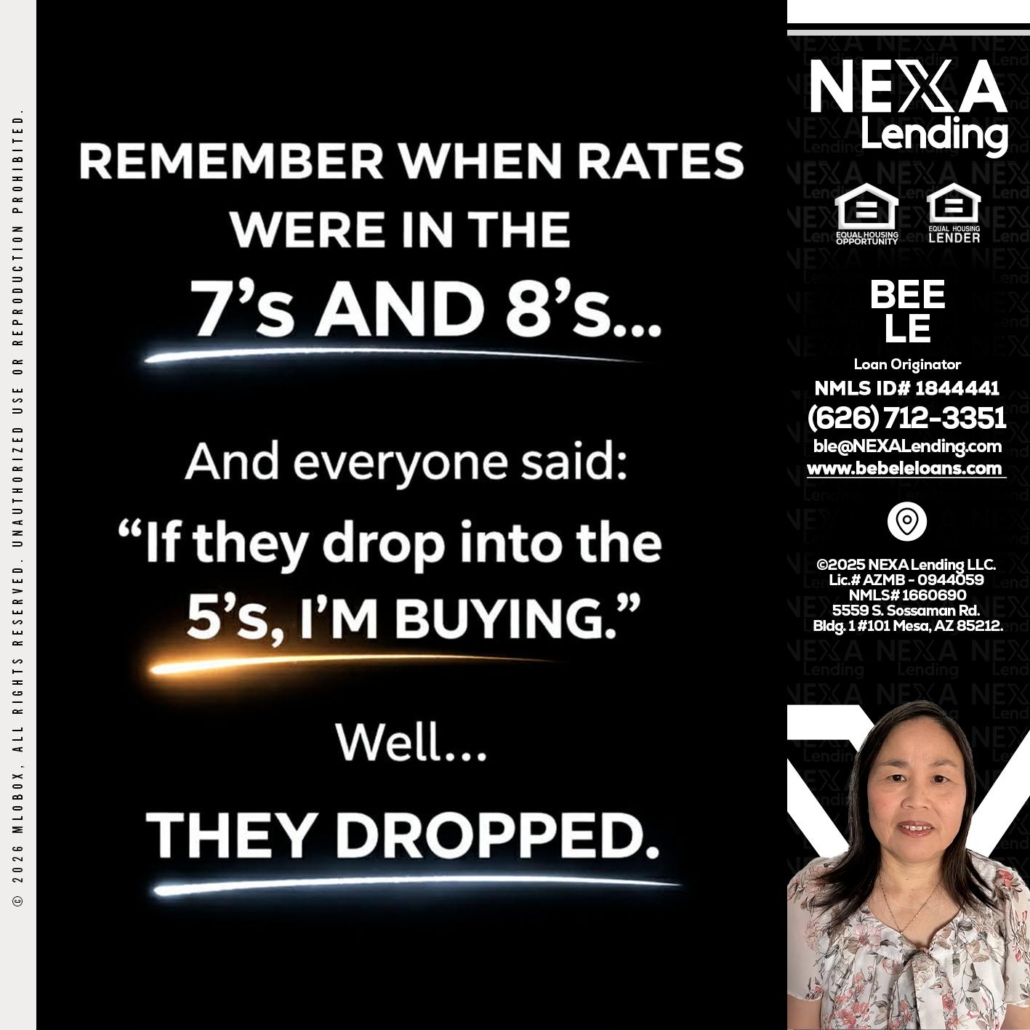 Hi, my name is Bebe Le- Serving California. I’m a Loan Officer with NEXA Lending LLC., offering personalized mortgage solutions, fast customized quotes, great rates and service with integrity.