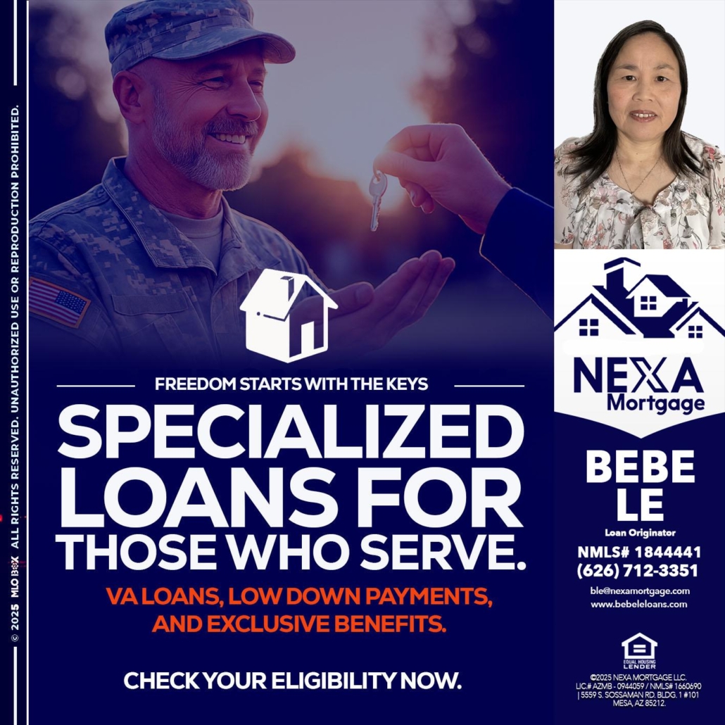 Hi, my name is Bebe Le- Serving California. I’m a Loan Officer with NEXA Mortgage LLC., offering personalized mortgage solutions, fast customized quotes, great rates and service with integrity.