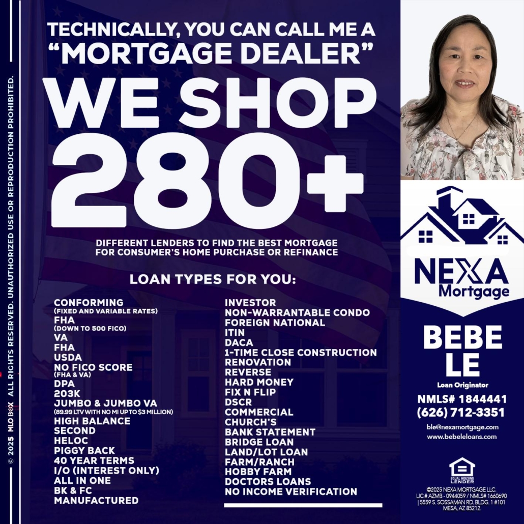 Hi, my name is Bebe Le- Serving California. I’m a Loan Officer with NEXA Mortgage LLC., offering personalized mortgage solutions, fast customized quotes, great rates and service with integrity.