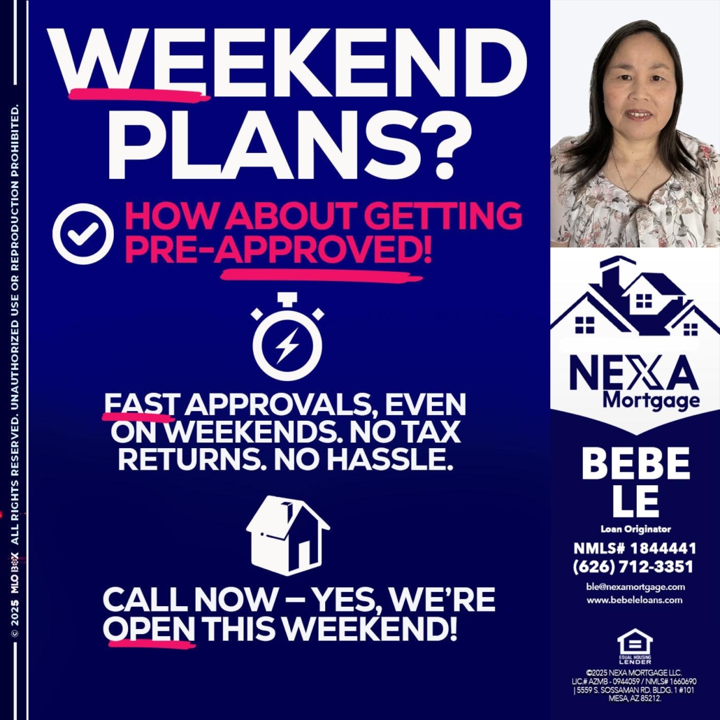 Hi, my name is Bebe Le- Serving California. I’m a Loan Officer with NEXA Mortgage LLC., offering personalized mortgage solutions, fast customized quotes, great rates and service with integrity.