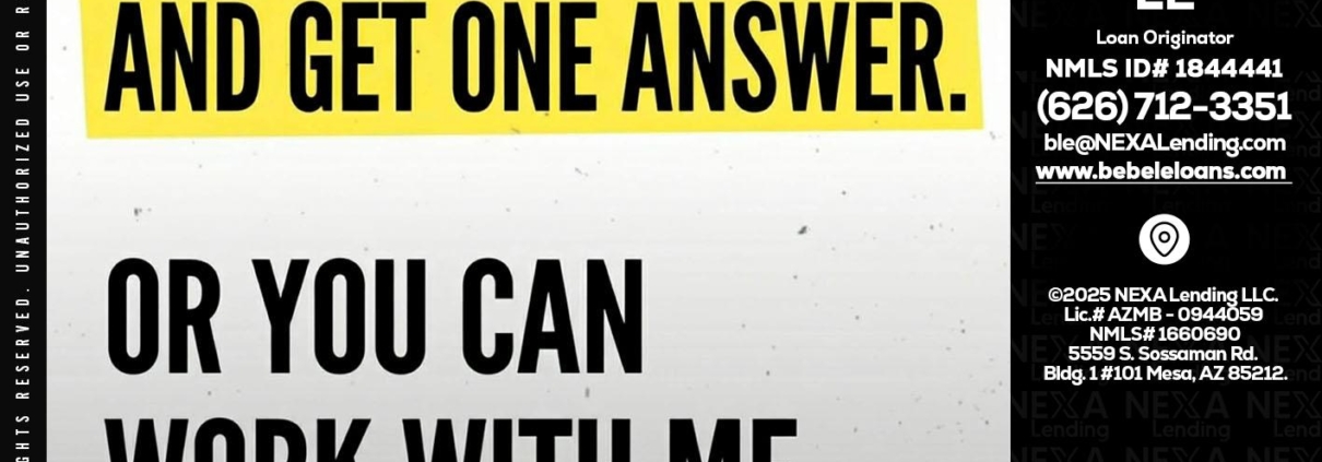 YOU CAN GO TO - Bebe Le- Serving California -Loan OriginatorHi, my name is Bebe Le- Serving California. I’m a Loan Officer with NEXA Lending LLC., offering personalized mortgage solutions, fast customized quotes, great rates and service with integrity.