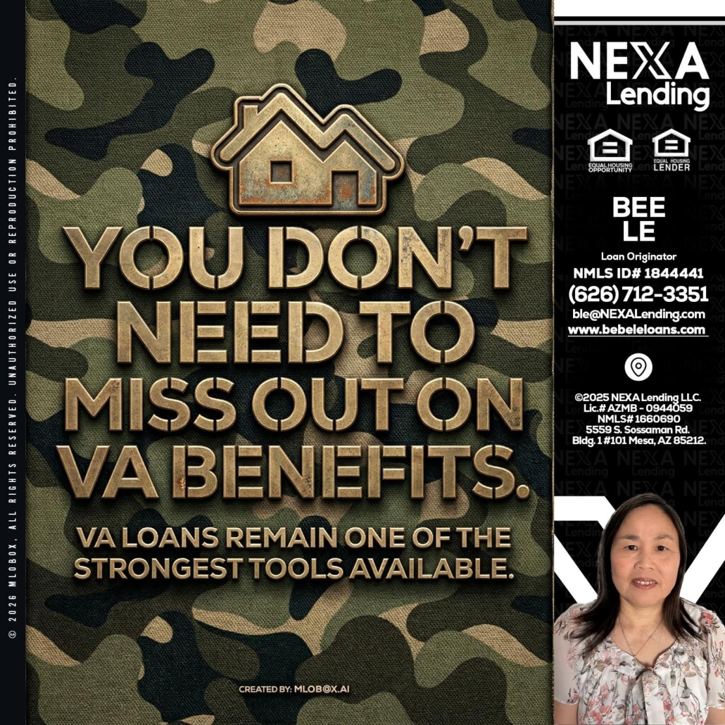 you don't need - Bebe Le- Serving California -Loan OriginatorHi, my name is Bebe Le- Serving California. I’m a Loan Officer with NEXA Lending LLC., offering personalized mortgage solutions, fast customized quotes, great rates and service with integrity.